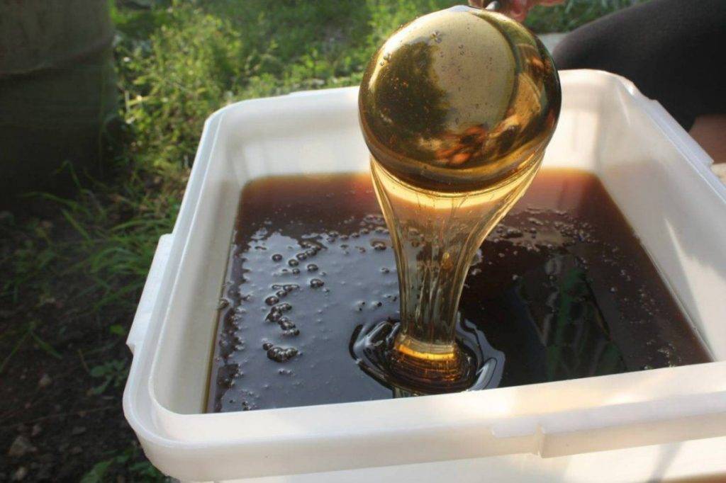 - Консистенцией. Падевый мед напоминает деготь. Это густая и вязкая масса.