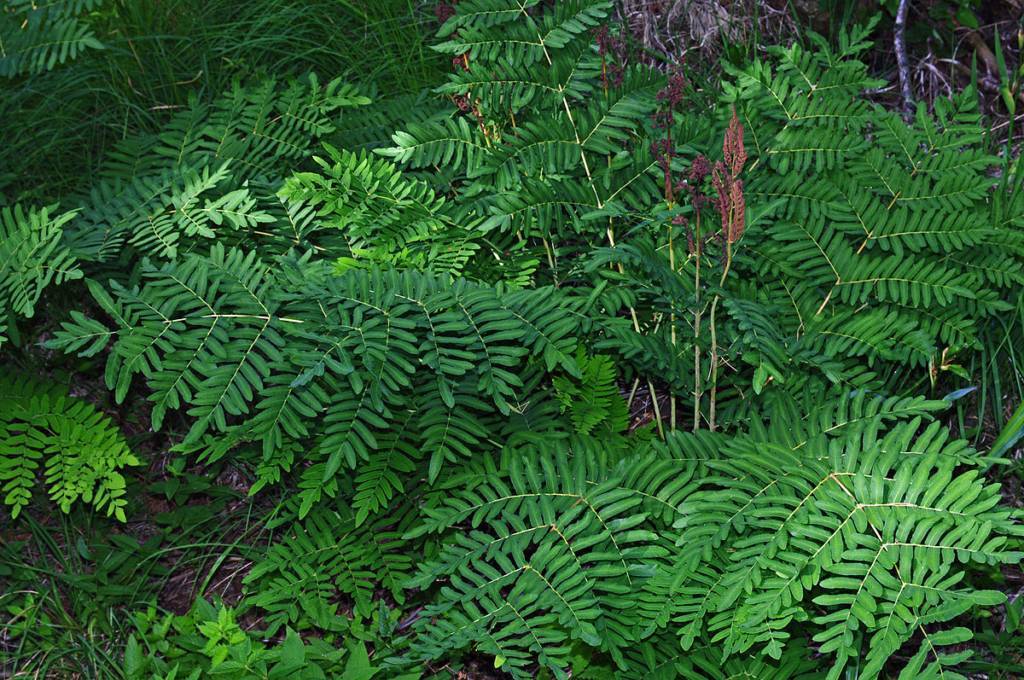Папоротник Осмунда – любит влажные места. В высоту достигают от 60 до 250 см. Стебли короткие, массивные, чем-то напоминают небольшое деревце. Украшают куст широкие двоякоперистые листья.