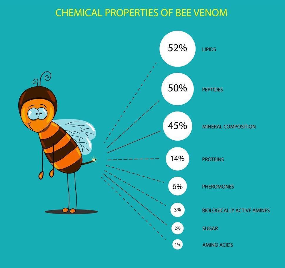 Пчелиный яд по свойствам схож с мощным антибиотиком. Вещество начинается образовываться в нитевидных железах пчел. Со временем количество вещества постепенно увеличивается и достигает максимума в возрасте 2 недель. Интересно то, что в зависимости от возраста, и их обитания состав яда может меняться.
