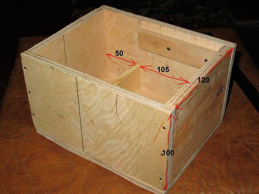 Следующий этап — корпус. Понадобятся пихтовые доски, шлифованные и обработанные антисептиком. Размеры — 360✕230 мм (2 шт.), и 338✕230 мм (2 шт.). В боковинах сделать отверстия под рамки, детали корпуса скрепить саморезами при помощи шуруповёрта. По бокам вырезать небольше выемки для транспортировки.