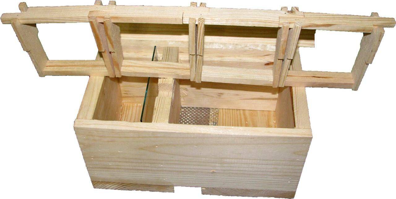 В случае увеличения производительности пчелиной семьи, сверху, над ящиком, можно установить дополнительные деревянные кассеты с рамками. Для дополнительной защиты от атмосферных осадков ящик иногда закрывают двускатной крышей.
