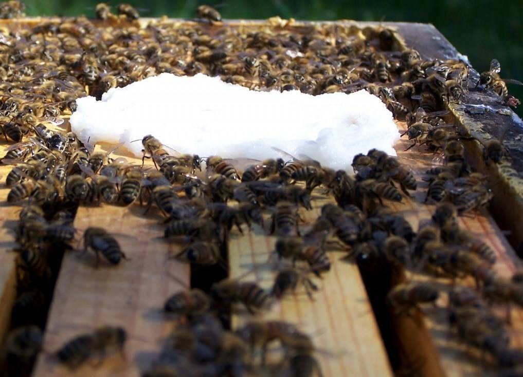 Для подкормки пчел рекомендуется за вставную доску поместить распечатанные рамки с малым количеством меда, предварительно опрыснутые сытой. Если таких рамок в наличии нет, тогда следует производить подкормку на основе сахара.