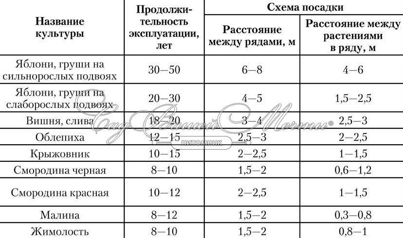 Каждое дерево или кустарник для нормального роста и плодоношения нуждается в достаточном пространстве. Высокорослые сорта яблони, груши, абрикоса, черешни нуждаются в площади питания не менее 30 квадратных метров, то есть расстояние между такими деревьями 5-6 метров. Для среднерослых культур (вишня, слива, персик, а также яблони и груши на карликовых подвоях) минимальное расстояние между деревьями 3-4 метра, для колонновидной яблони — 2 метра. Для ягодных кустарников расстояние между растениями — не менее метра. Пока кроны деревьев не разрослись, расстояние между ними можно использовать под посадки ягодных кустарников, земляники или овощей, за исключением приствольного круга не менее метра вокруг ствола.