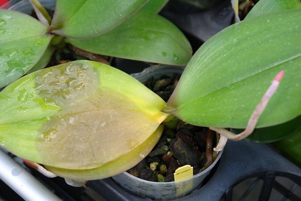 - 3 На растении возникают водянистые пятна с желтоватыми краями. В большинстве случаев причиной является мягкая гниль, которая вызвана бактериальной инфекцией. Болезнь развивается быстро. Цветок пахнет гнилыми овощами, становится водянистым, а потом вянет. Иногда подобный симптом связан с солнечным или тепловым ожогом. В таком случае у повреждений будут темные края. Листья не восстановятся. Необходимо пересмотреть условия содержания орхидеи.