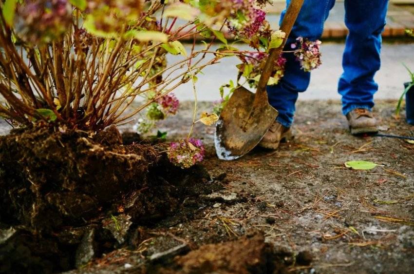Важно! Категорически не рекомендуется пересаживать гортензию в цветущем состоянии. В северных регионах осеннее перемещение кустарника не выполняют по причине короткого адаптивного периода — за холодную осень куст не приспособится к почве