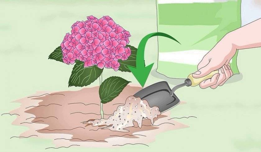 Создавая подходящие условия выращивания гортензии, посадочную яму заполняют смесью кислого (верхового) торфа и песка в пропорции 3:1. Ни навоз, ни известь (или золу) в посадочную яму добавлять нельзя. Можно в небольшом количестве добавлять перегной.