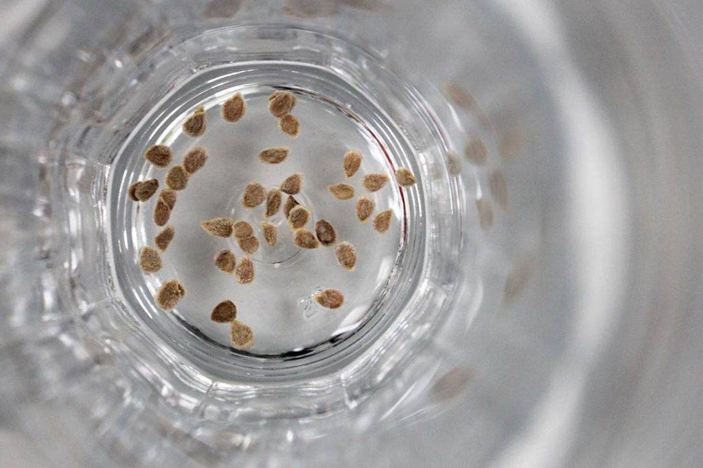- Семена сложите в емкость с высокими стенками и залейте слабым раствором соли. Оставьте в тепле на 12 ч. Пустые негодные семена всплывут на поверхность. Соберите и выкиньте их, а оставшиеся отцедите через сито и ополосните чистой водой.