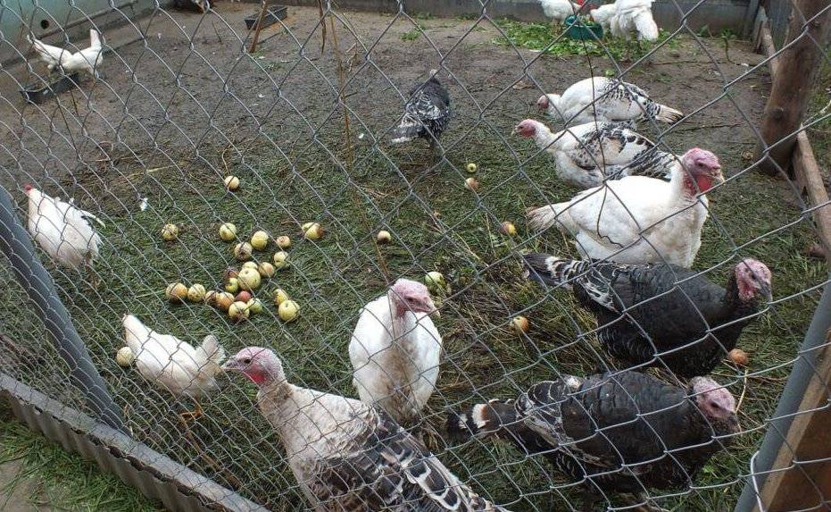 С южной стороны птичника располагают зону выгула – ее огораживают сеткой и закрывают сверху, чтобы исключить контакт с дикими птицами. Предусматривают навес для защиты от дождя и яркого солнца. Площадку засевают травой, чтобы во время выгула индюки имели доступ к витаминному корму.