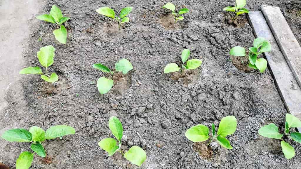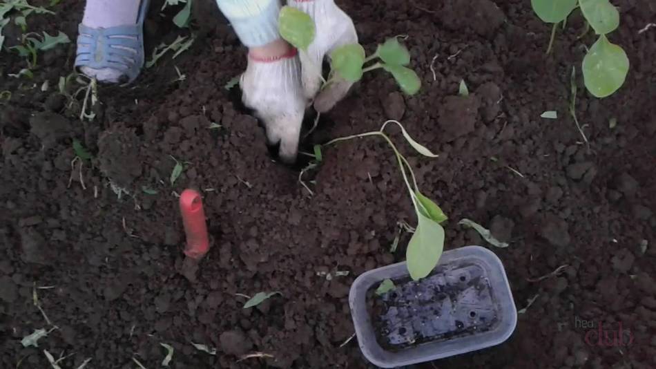 На грядке выкапывают лунки глубиной 20 см или же руководствуются правилом, по которому глубина лунок должна быть в 2 раза больше высоты горшочков, в которых растет рассада.