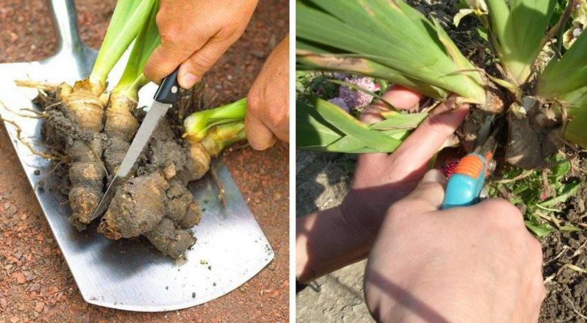 - Провести деление на части согласно числу ростков. Сделать это можно при помощи ножа или секатора. Делить нужно так, чтобы на каждой части был хотя бы один годовалый корневой прирост и листья.