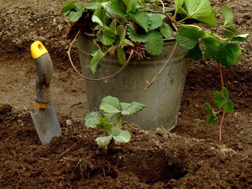 Высадка ягоды осуществляется глубоко. Так можно избежать перемерзания зимой в тех местах, где листочки отходят от корневой системы. По завершении посадки почву нужно хорошо пролить водой.