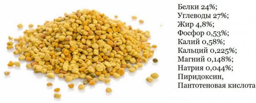В составе пыльцы много углеводов – от 25 до 48%, белков – 20-30%, жиров – 3-17%, минеральных веществ – от 15%. Среди углеводов преобладают глюкоза и фруктоза, сахарозы бывает в среднем 5%, крахмала – 3-4, целлюлозы 7-8%.Белки представлены альбуминами, глобулинами, мукопротеидами, ферментами, а также всеми аминокислотами, том числе и незаменимыми (валин, лейцин, изолейцин, лизин, метионин, триптофан, треонин, фенилаланин).