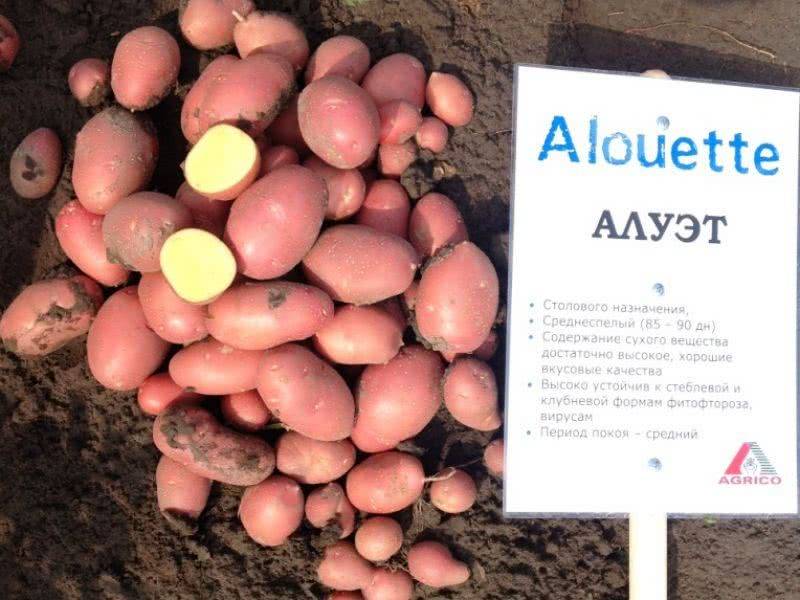 Алуэт. Среднеспелый сорт, ботва прямостоящая. Масса клубня 97-125гр, содержание крахмала 14,1-16,7%. Клубень овальный, красного цвета, мякоть желтая, вкус отличный, лежкость отличная. Урожайность до 388кг/сот. Устойчив к возбудителю рака картофеля и золотистой нематоде, устойчив к фитофторозу по ботве и клубням.