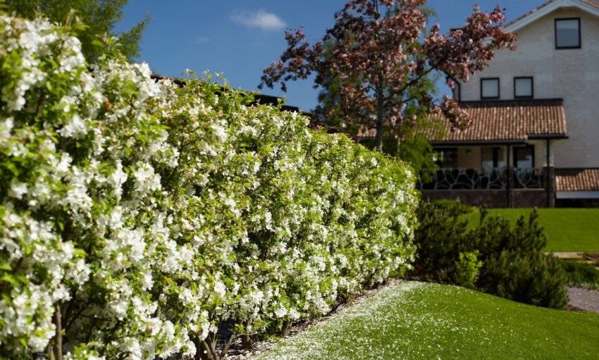 При высадке в лесосадах жасмин занимает нижний ярус, располагаясь под большими деревьями, но в этом случае нельзя допускать условия постоянной тени, иначе кустарник перестанет цвести. Для живых изгородей больше подойдут высокие сорта жасмина, достигающие 2–3 м. Придавать им подходящую форму намного проще, чем 70-сантиметровым экземплярам. Растение отлично сочетается с гортензией, спиреей и вейгелой. Такие композиции можно нередко встретить на дачных участках. Существуют также вьющиеся сорта, из которых оптимально создавать декоративные садовые арки, установив металлические каркасы.