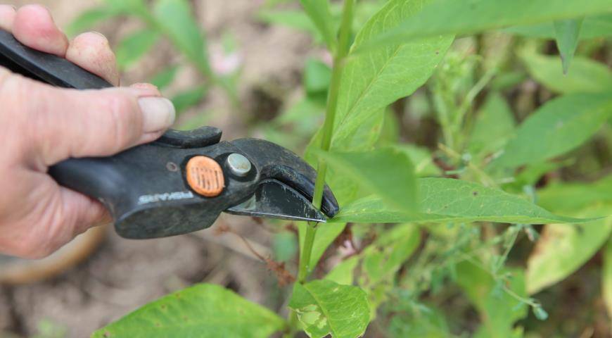 Листовые пластинки с нижнего узла удаляют, сохраняя пазушные почки, на верхнем – обрезают наполовину.