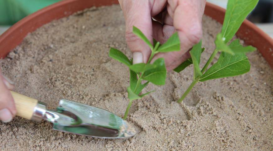 Подращивать черенки можно сразу в школке (разводочной грядке с защитой от прямых солнечных лучей и возможностью контролировать уровень влажности) или сначала укоренить в кашпо, а потом высадить в школку. Сажать черенки удобно с помощью пикировочного колышка. Черенок погружают в почву до верхнего узла. Грунт должен быть рыхлым, воздухопроницаемым. Верхний слой желательно присыпать мелким речным песком – он предохранит почву от иссушения и не даст образоваться корке.