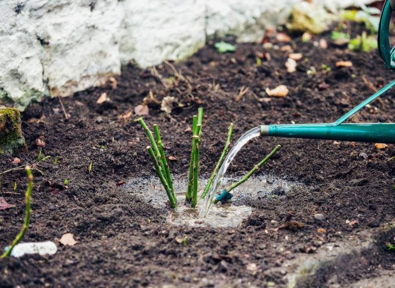 После посадки саженец обильно поливают, засыпают землей, слегка ее притаптывают. У основания куста из грунта насыпают небольшой холмик. Под ним формируется корневая система растения. Через 2 недели насыпь можно разровнять.