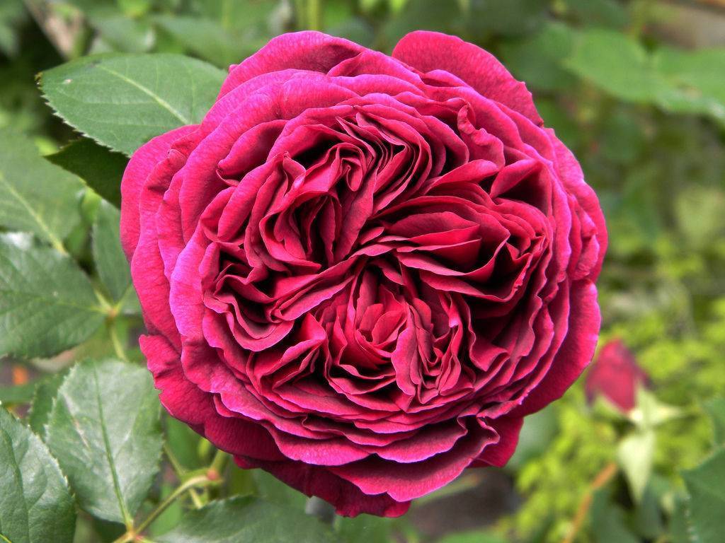 Роза Остина Фальстаф похожа на идеальный старинный розовый куст, а ведь селекционер и стремился этого добиться при выведении новых видов. У этого гибрида крупные густомахровые бутоны, которые появляются на прямостоячих крепких стеблях. Окраска бархатных лепестков темно-малиновая с характерным фиолетовым отливом. Размер цветков не менее 12-14 см.