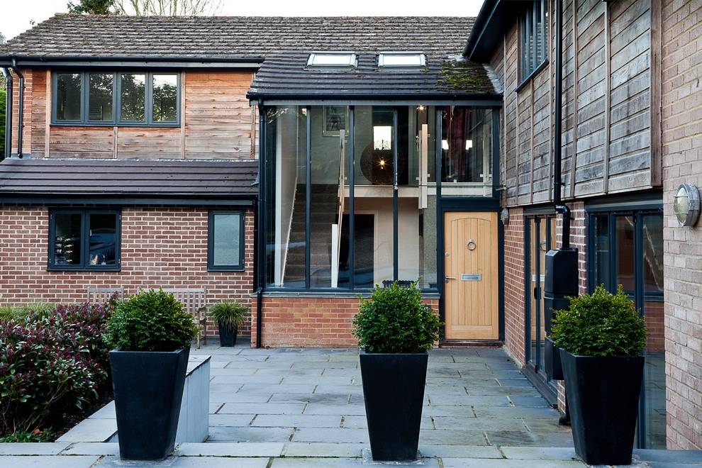 Создать красоту вокруг главного входа помогут подобранные в общую цветовую гамму высокие горшки с цветами