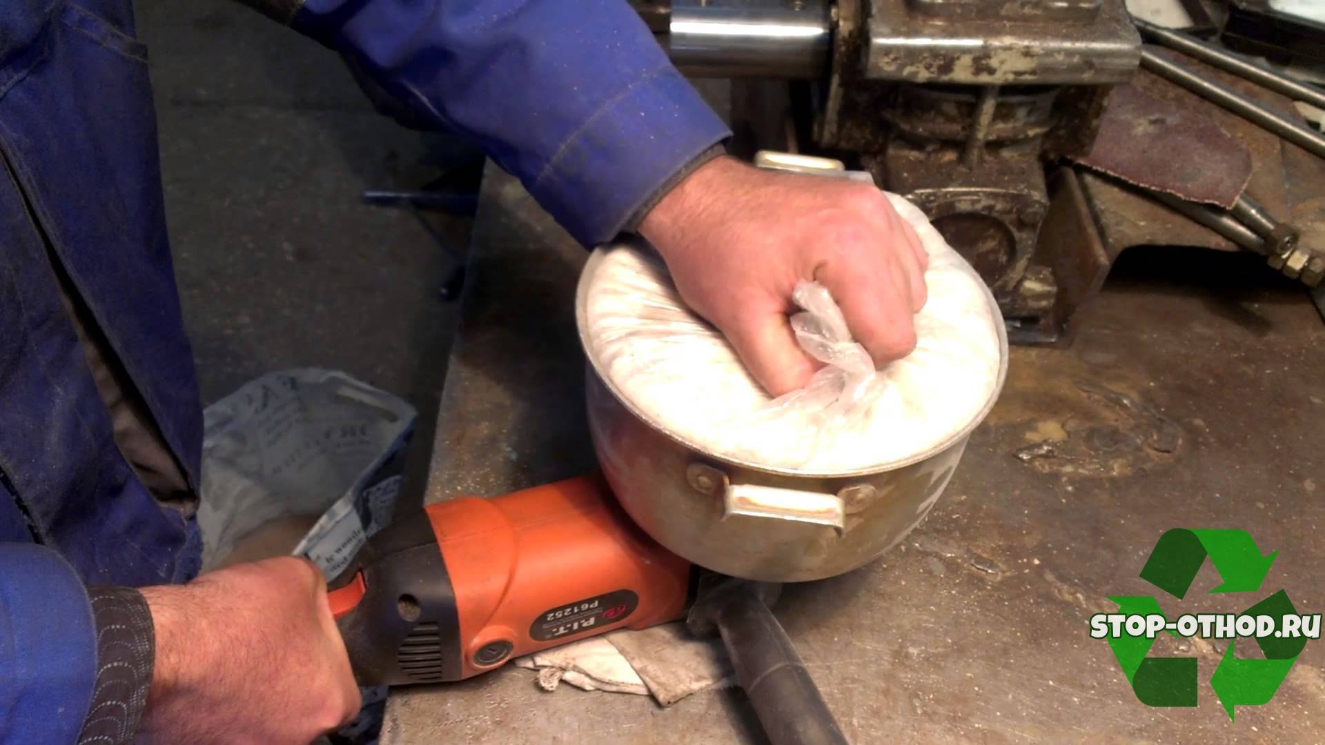 Понадобится какая-нибудь емкость. Например, ведро (подойдет даже пластиковое), кега от пива, глубокий тазик. По центру делается отверстие, равняющееся диаметру шпинделя болгарки. Что касается УШМ, то она должна быть от 2,5 до 3 киловатт. Диаметр диска не менее 180 и чем больше – тем лучше.