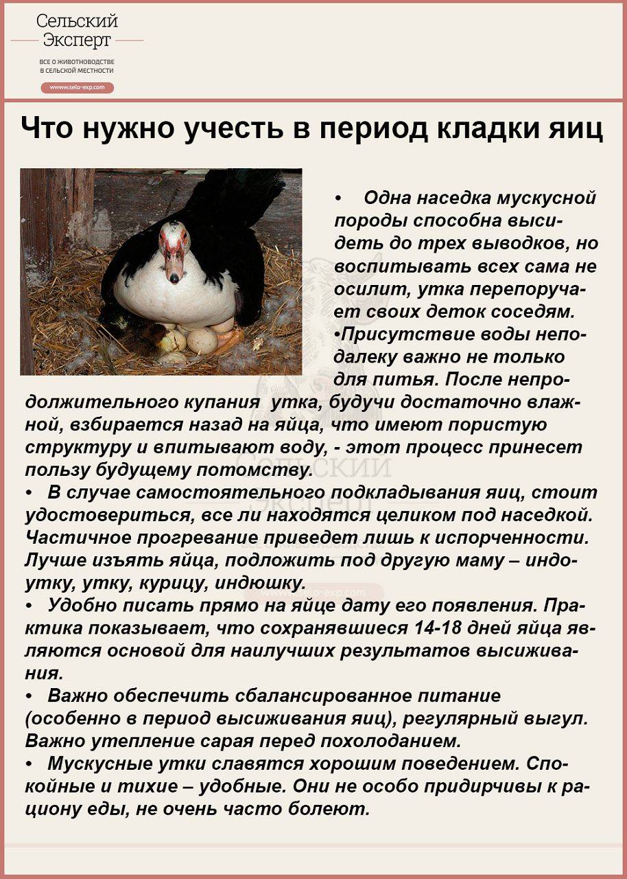 Закрыв мускусную утку для ознакомления с гнездом, не оставляйте ее запертой более шести дней, это уже бесполезно. Лучше попробовать посадить на яйца одновременно несколько уток.