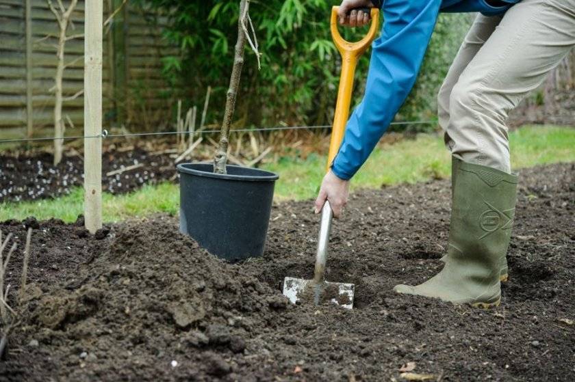 Посадочную яму нужно подготовить за 3–4 дня до посадки. Размер ямы — 60×70 см. Верхние 30 см почвы из ямы смешивают с 20 кг компоста и 400 г нитрофоски. Состав тщательно перемешивают и послойно вместе с чистой землёй закладывают в яму обратно. Заполнить лунку следует на треть. Затем в центр ямы вбивают длинный кол, который послужит опорой для саженца. После всех этих манипуляций в яму заливают 20 л воды.