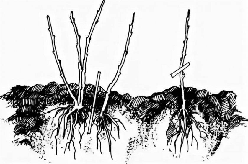 Верхушка должна оставаться над поверхностью земли (её можно даже немного подпереть, чтобы она держала вертикальное положение). К осени отводки хорошо укоренятся, их можно будет отделить от материнского куста и пересадить на постоянное место, но лучше перестраховаться и провести процедуру следующей весной.