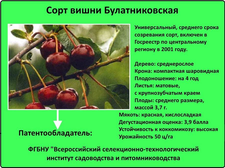 Урожайность вишни Булатниковская средняя, составляет около 50 ц/га, в отдельные годы может быть меньше. Показатель зависит от климатических условий и соблюдения агротехники.