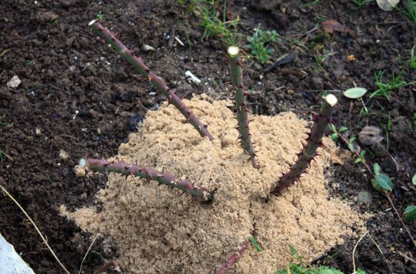 В конце листопада на кустарнике привитые штамбы приклоняют в сторону ряда, закрепляя их у земли и окучивают почвой, взятой между рядами.