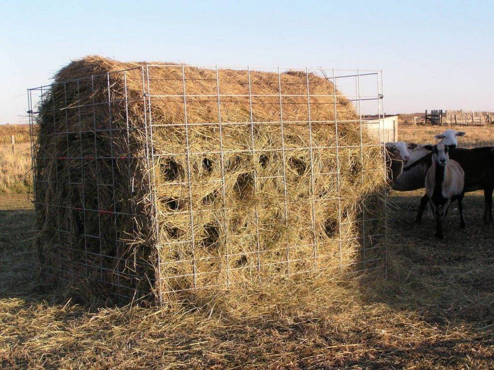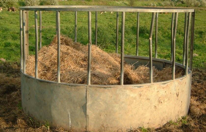 Оптимальным вариантом можно назвать коническую ёмкость, куда можно поместить рулон сена. Преимущества такой конструкции — малые потери сухого корма, по сравнению с установкой стожков или просто кучей скошенного сена, поскольку животные едят его по мере необходимости и не втаптывают его в землю. Кормушка представляет собой конструкцию в виде перевернутого треугольника или конуса с боковыми стенками из прутьев, в которую помещают рулон сена. Внизу находится поддон, куда собираются мелкие сухие травинки.