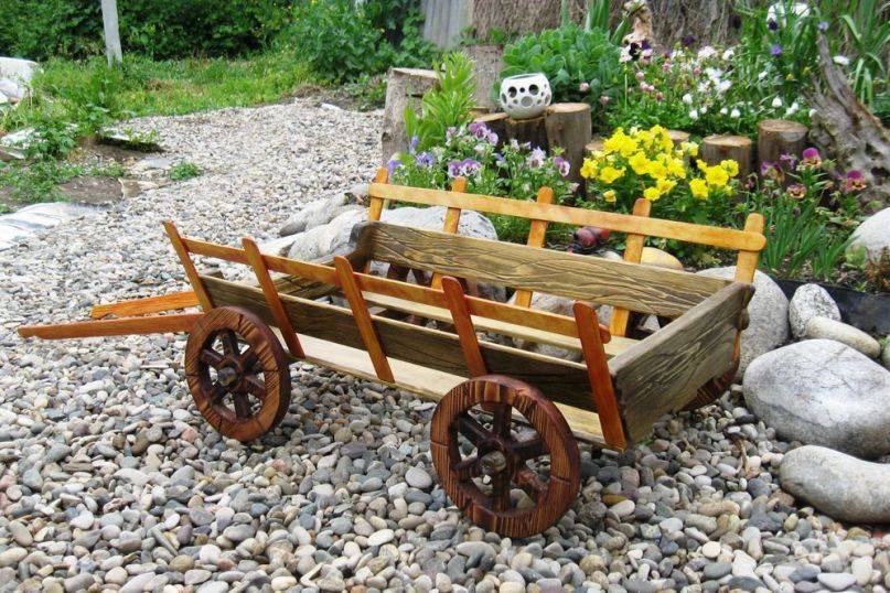 После декоративную заготовку устанавливают на ровный участок сада и обшивают досками красивых цветов. Для старинного дизайна будущей телеги может использоваться лаковое покрытие.