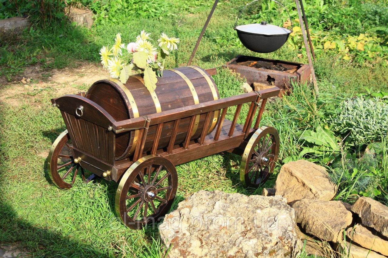 Хотите что-нибудь покруче? Не вопрос! Старая бочка и автомобильное колесо – вполне доступные атрибуты. Как видите, дизайн тележки имеет значение.