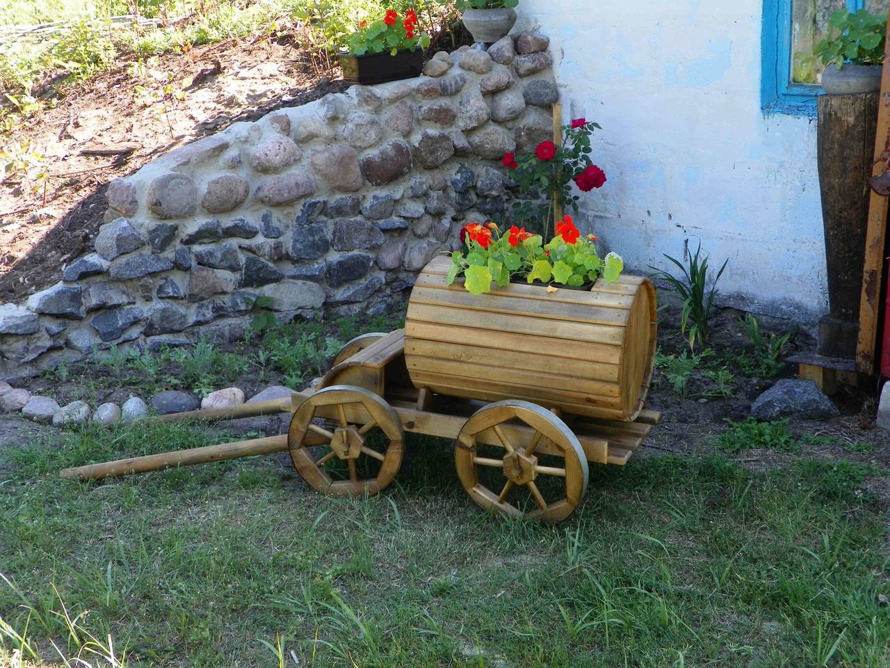 После декоративную заготовку устанавливают на ровный участок сада и обшивают досками красивых цветов. Для старинного дизайна будущей телеги может использоваться лаковое покрытие.
