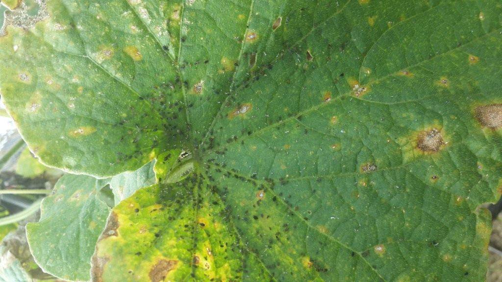 Если была замечена тля на огурцах, снизу листьев, бывает достаточно срезать атакованные ей листья. Если её много необходимо подвергнуть обработке все растения. Предварительно собрав весь созревший урожай.