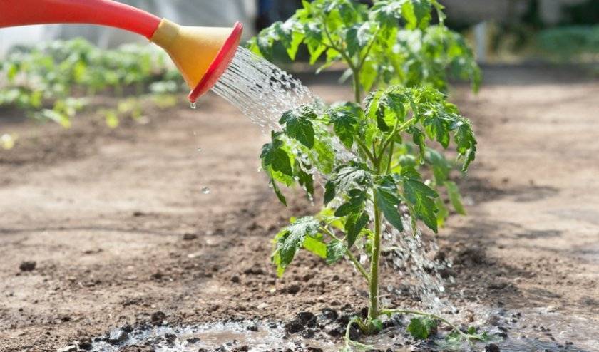 Полив осуществляют рано утром или вечером, ближе к заходу солнца. Даже в жару для орошения кустов томатов нужно использовать только тёплую воду.
