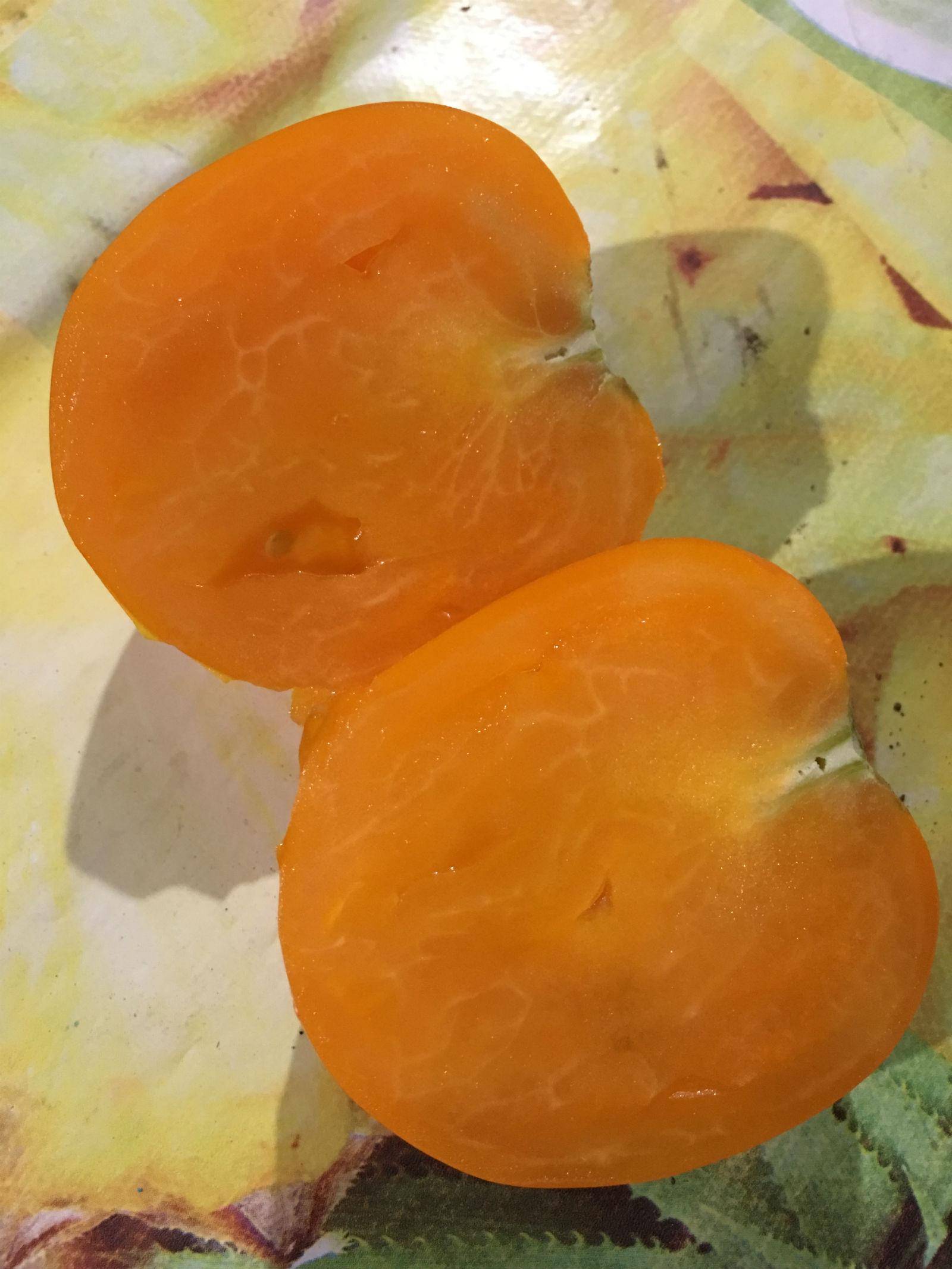 | Плоды | Крупные. Вес каждого варьируется в пределах 200-300 г. Цвет кожицы желтый или оранжевый, внутри помидоры желтые. Зеленого пятна у основания нет. Форма плодов округлая, выровненная, приплюснутая у основания. Присутствует слабо выраженная ребристость. Кожица глянцевая. Вкус кисло-сладкий, с насыщенным томатным ароматом. Мякоти много, она плотная, но не жесткая. Концентрация сухого вещества не превышает 6%, а сахаров – 3,5%. Камер с небольшим количеством семян – от 5 до 8 в каждом плоде |