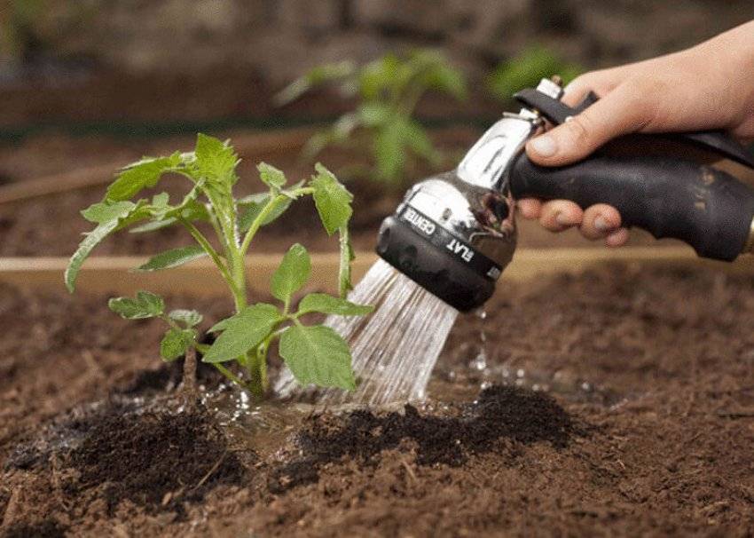Во время высадки в открытый грунт лунку для растения поливают, затем делают перерыв на неделю, чтобы дать возможность прижиться и начать рост. Полив проводят ближе к вечеру под корень, не увлажняя листья, чтобы не заболели. Количество воды должно быть таким, чтобы слегка увлажняло землю — до появления плодов избыток влаги растениям не нужен. Достаточно будет 1 раза в 7-14 дней.