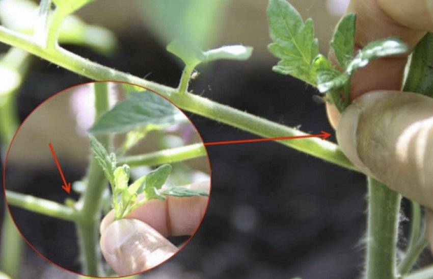 Формирование куста в один стебель заключается в удалении всех пасынков, т. е. боковых побегов, которые вырастают из лиственных пазух. Если куст будет сформирован в два стебля, то оставляют центральный побег и пасынок, расположенный под первой цветочной кистью, который должен стать вторым стволом. Процедуру осуществляют сразу же после высадки саженцев на постоянное место. По мере появления новых пасынков, их общипывают.