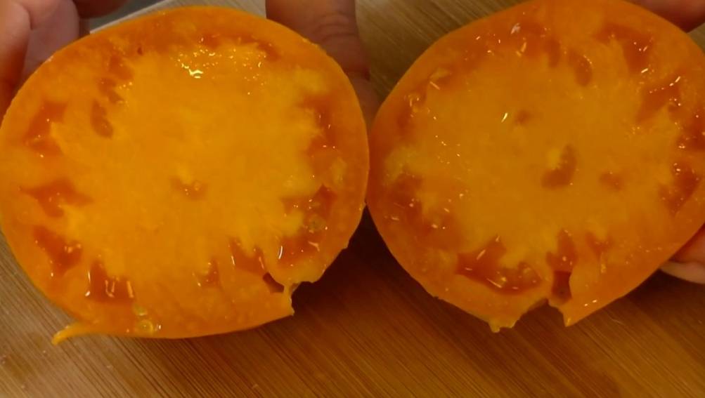 - Вкусовые качества отличные. Мякоть очень мясистая и сочная, с высокой сахаристостью, пустот нет и семечек мало, имеет очень сильный аромат. В свежем виде томат особенно хорош, он идеально подходит для детского питания. Также из плодов выходит отличный сок и пюре.