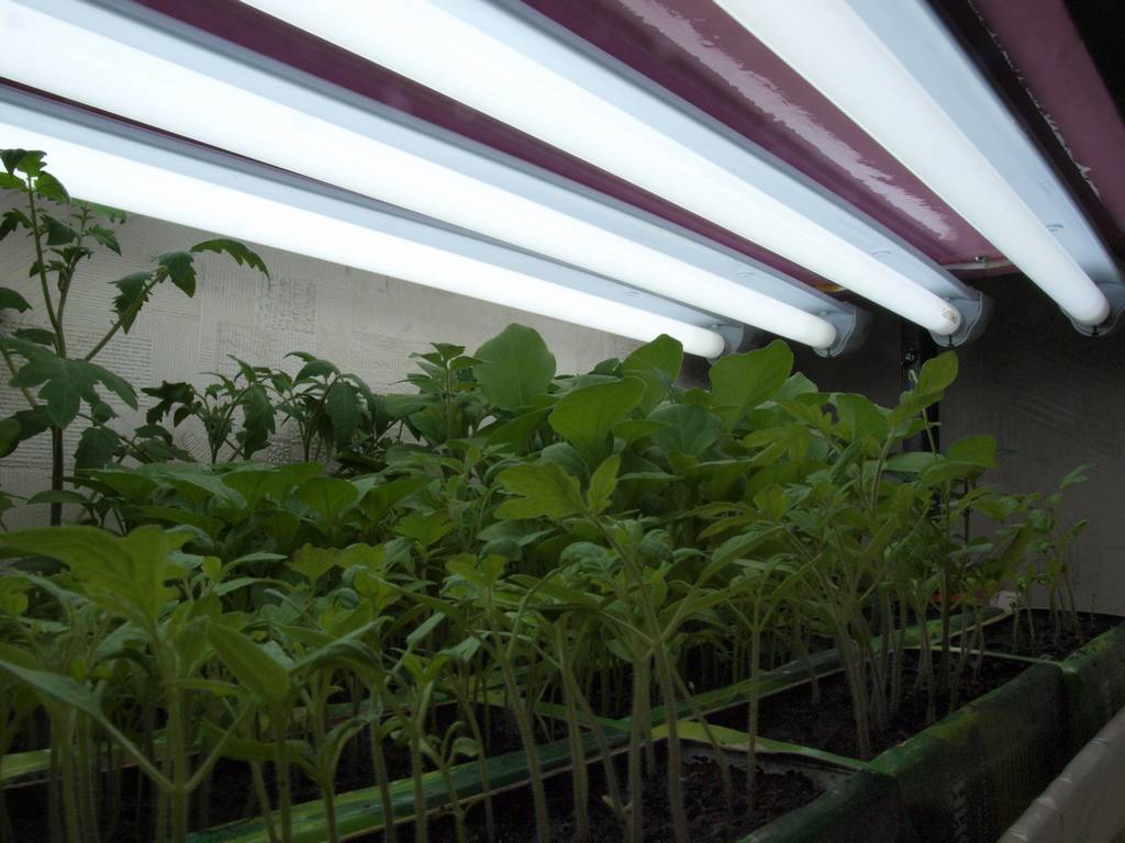 Томаты — растения длинного солнечного дня, поэтому в весенний период они требуют организации дополнительной подсветки. Это могут быть обычные лампы дневного света (люминесцентные) или специальные фитолампы. Держать лоточки с саженцами помидор на подоконнике, как это обычно принято, не всегда оправдано. Холодный воздух поступает не только через минитрещины в раме, но на близком расстоянии ощутим и от оконных стекол, что в сочетании с прямыми солнечными лучами в обеденное время создают не лучшие условия для роста.
