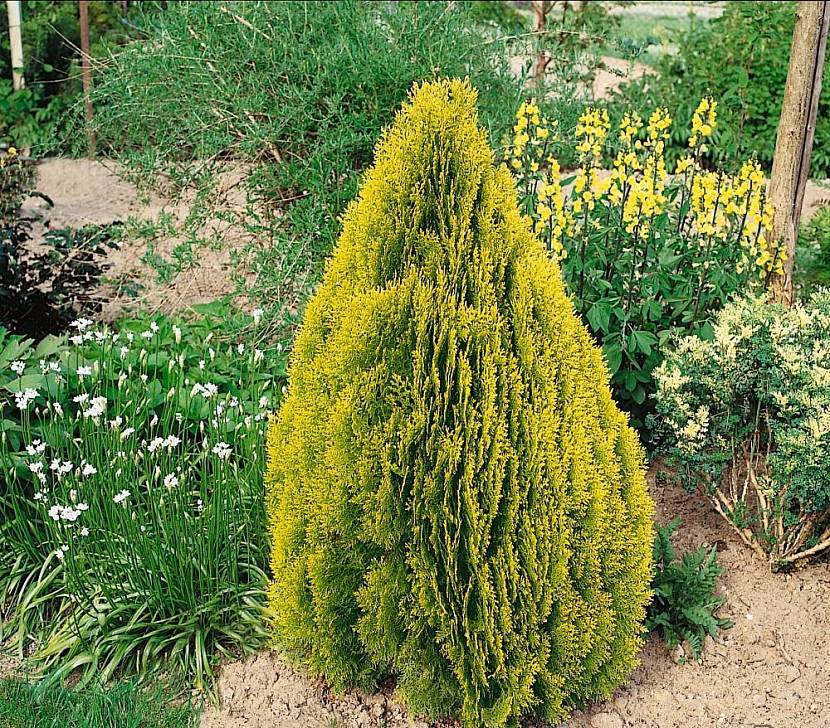 Туи отлично сочетаются с цветущими растениями. Они создают для них красивый задний план. Чаще всего на клумбах описываемый хвойник можно встретить с маками, баданом, ирисами, геранью, петуниями, дельфиниумами, флоксами, лилиями и первоцветами.