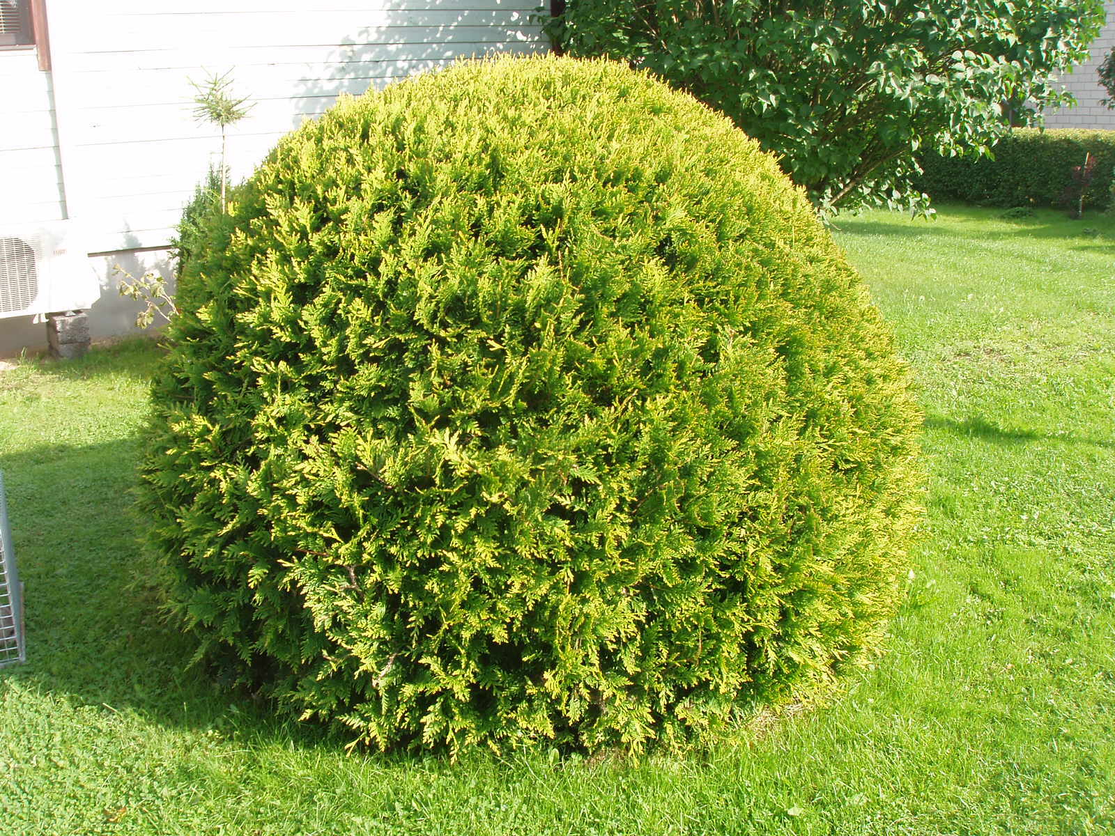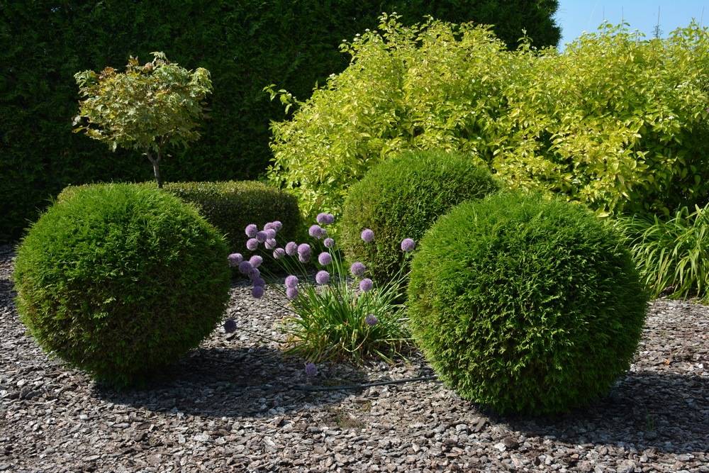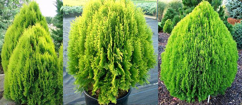 Туа шаровидная с плотными шаровидными ветвями. Растут они довольно медленно, благодаря чему не нарушают композицию.
