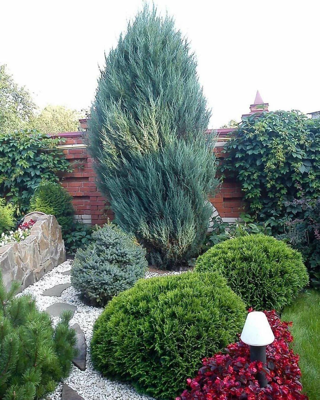 Если у центрального элемента хвоя серебристого оттенка, рядом лучше разместить дерево или кустарник с яркой темной листвой или хвоей. Сезонная яркая растительность добавит цвет.