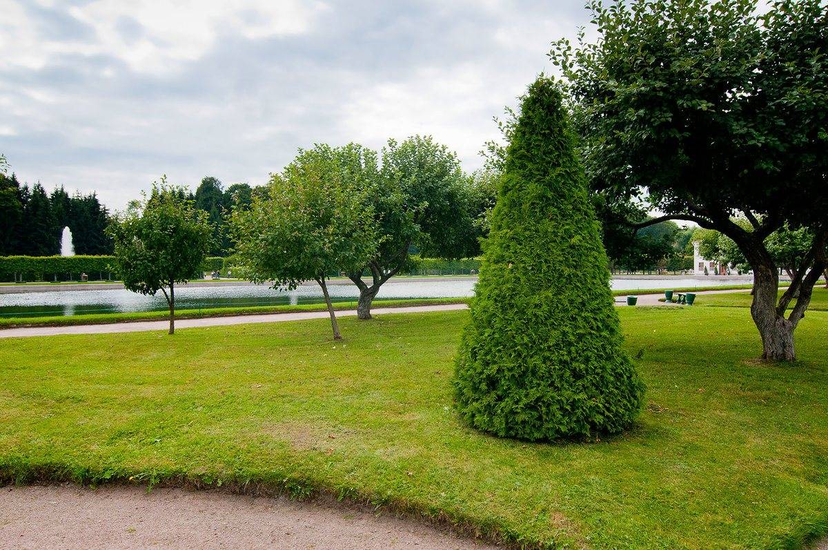 Полноценно композиция воспринимается на расстоянии, соответствующем двум ее высотам. Участок до хвойника засаживается газоном, на фоне которого многие вечнозеленые деревья и кустарники смотрятся ярко, контрастно, не сливаясь с окружающей флорой.