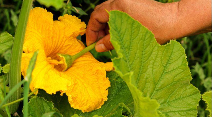 Для ручного опыления сорвите мужской цветок с пыльцой, аккуратно оборвите лепестки и разнесите пыльцу на пестики женских цветков