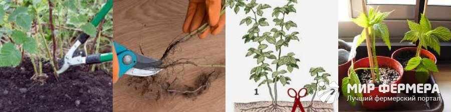 Если планируется заготовка зеленых черенков, лучше выбрать пасмурный день и срезать необходимое количество побегов с корневых отпрысков (ниже уровня почвы). Одревесневшие черенки используются, преимущественно, для размножения ремонтантной малины. По сути, нужно срезать часть корня с боковым отростком толщиной не более 2 мм. В отличие от зеленого черенкования, заготовка одревесневших черенков проводится ранней осенью, во время первой обрезки.