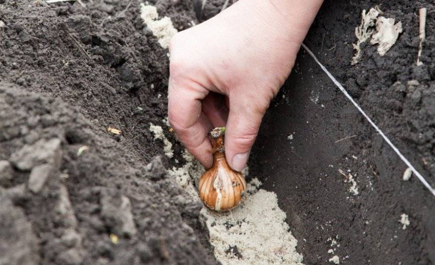 Выкопайте на подготовленном участке посадочные ямки, глубина которых должна быть равна 3 диаметрам луковички. Затем в ямку засыпают горсть песка, 2 большие ложки древесной золы и укладывают туда луковицу. Засыпьте ямку до половины землей, смешанной с компостом, и хорошо полейте, после этого заполните ее грунтом доверху и утрамбуйте его поверхность.