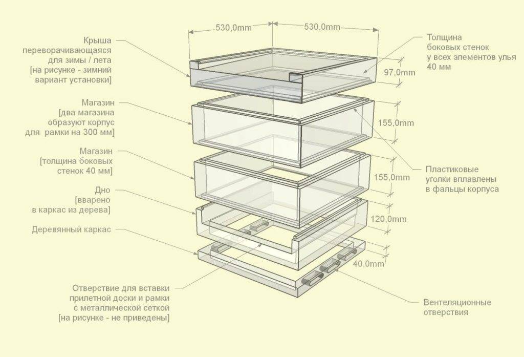При самостоятельном изготовлении важно, чтобы все детали в точности соответствовали чертежу, не имели перекосов и неровностей. Обязательно нужно защитить торцы ППС-деталей пластиковыми накладками: пенополистирол не будет крошиться, а соблюдать чистоту в улье станет намного проще
