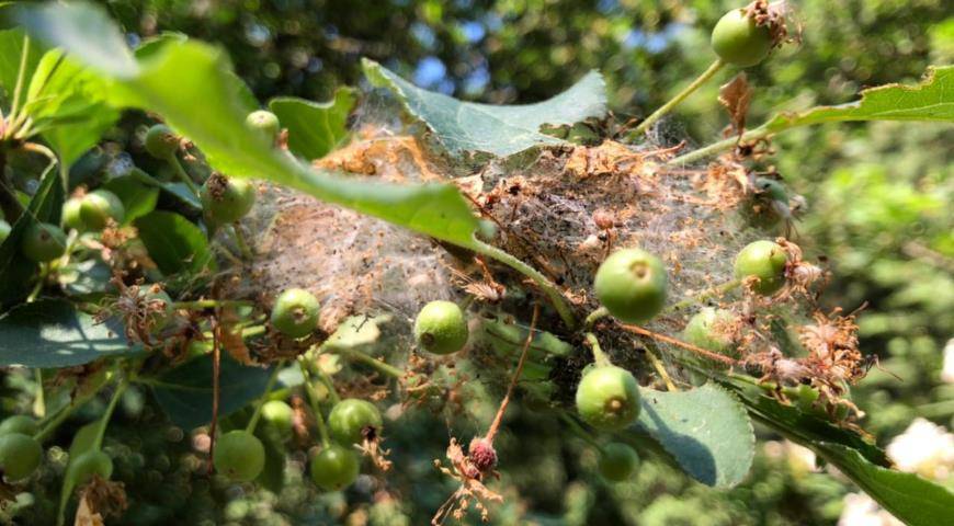 Гусеницы яблонной моли тоже окружают себя паутиной, только живут колониями. Экологически безопасные меры борьбы – это настой полыни, табака, чеснока. Можно вырезать гнездо и сжечь. А еще хорошо ловить бабочек на свет (световые ловушки), т.к. они ведут ночной образ жизни.