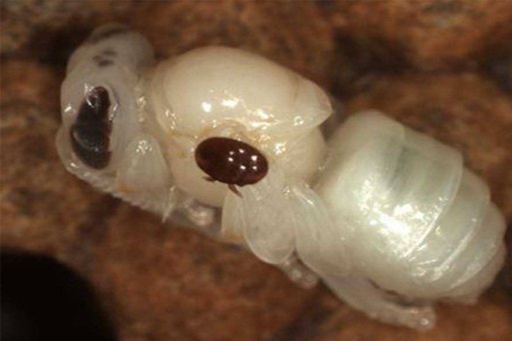 Личинка пчелы, пораженная клещом Варроа